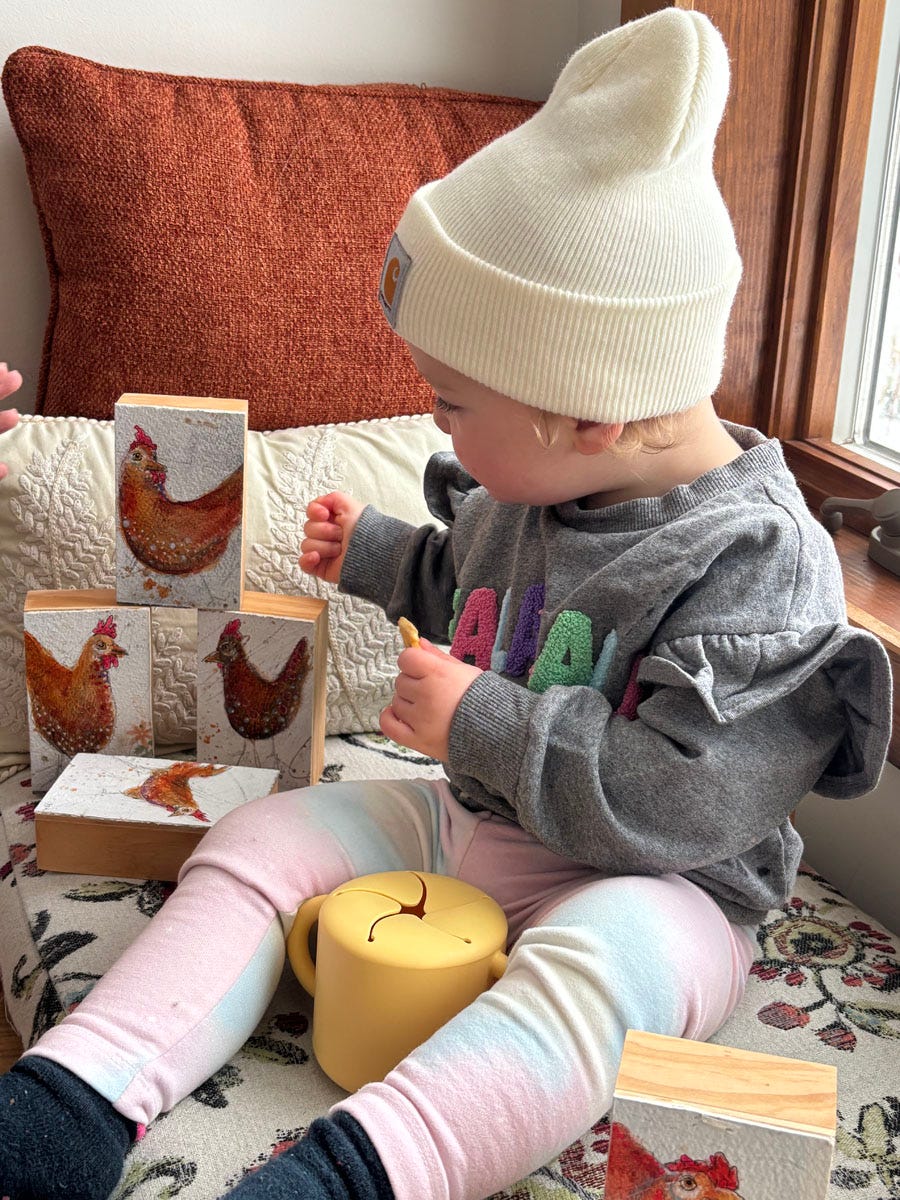 And my whole family became involved in the process. They helped me choose the top 20. Chicken riddles and chicken puns sprinkled laughter throughout Thanksgiving. My adult kids started doodling chickens. The chickens became great stacking blocks for little Matilda, a family friend. We were graced with the happy chickens all around us. Gotta admit, I’m going to miss them.
