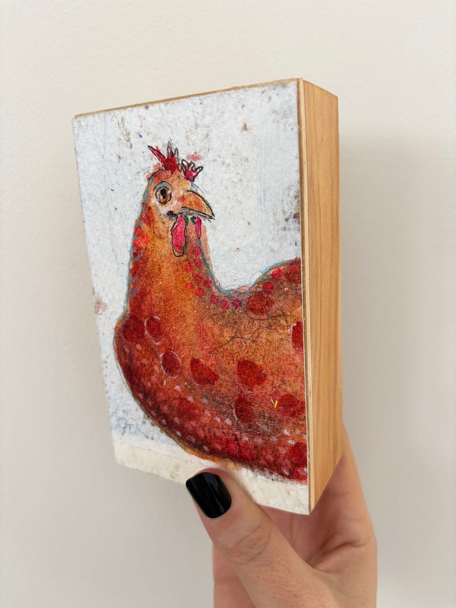 I started my happy chicken paintings on top of paintings a good friend gave me to reuse. I thought of her the whole time. (Thanks Barbara!) These chickens have great karma.