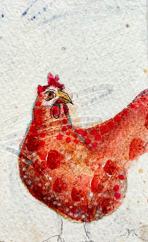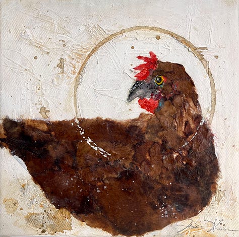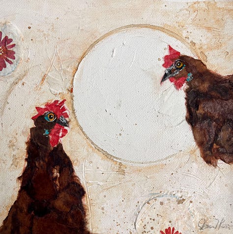 Favorite new skill: Raising chickens. What a joy. And what a treat to paint them (Happy Chickens). They help keep me laughing.